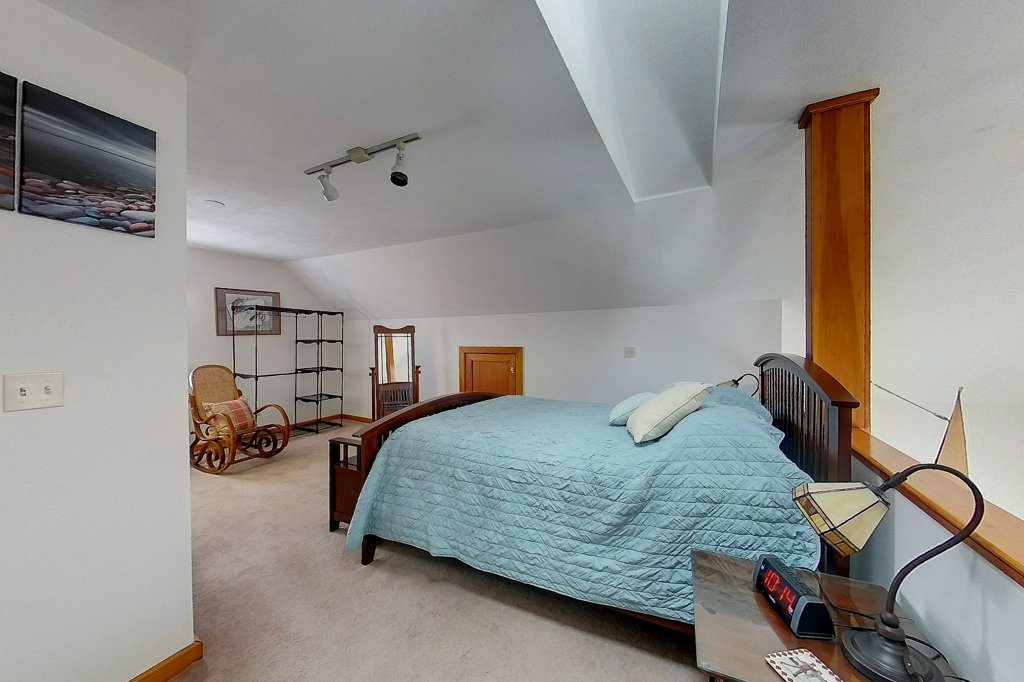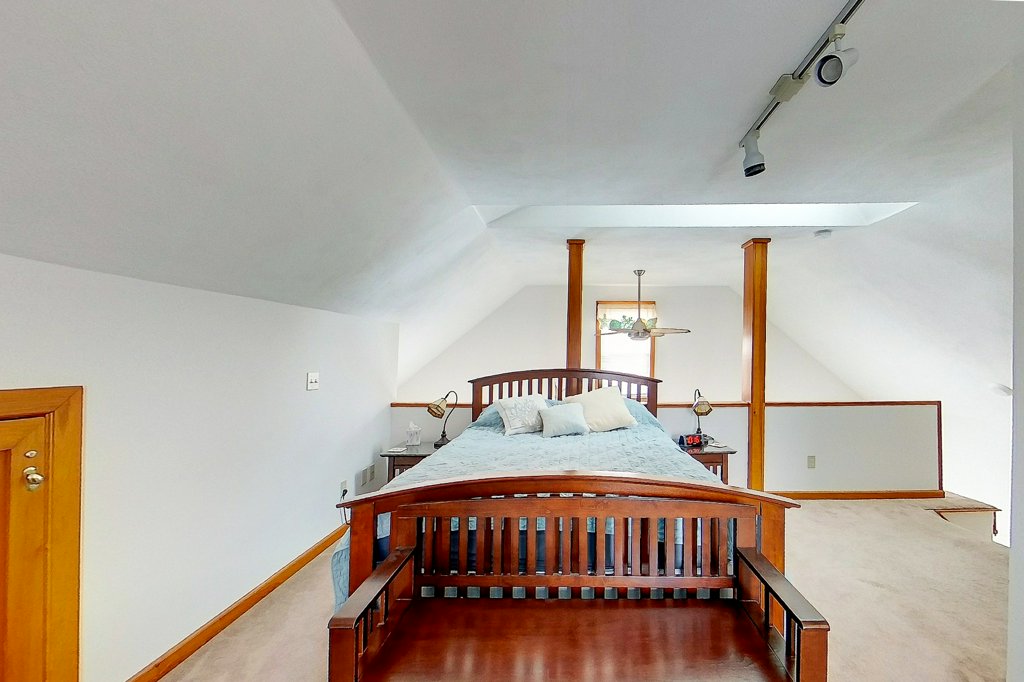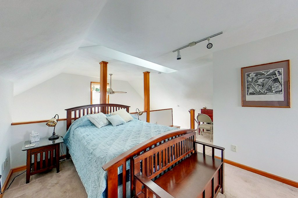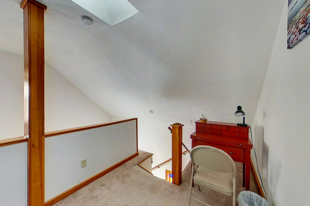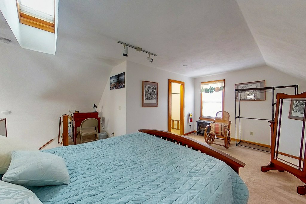 The main level features high ceilings and a spacious open floor plan, enhanced by warm wood trim and large windows that make the space bright yet cozy. Upstairs, you’ll find a comfortable bedroom with a newly added skylight and a walk-in closet.